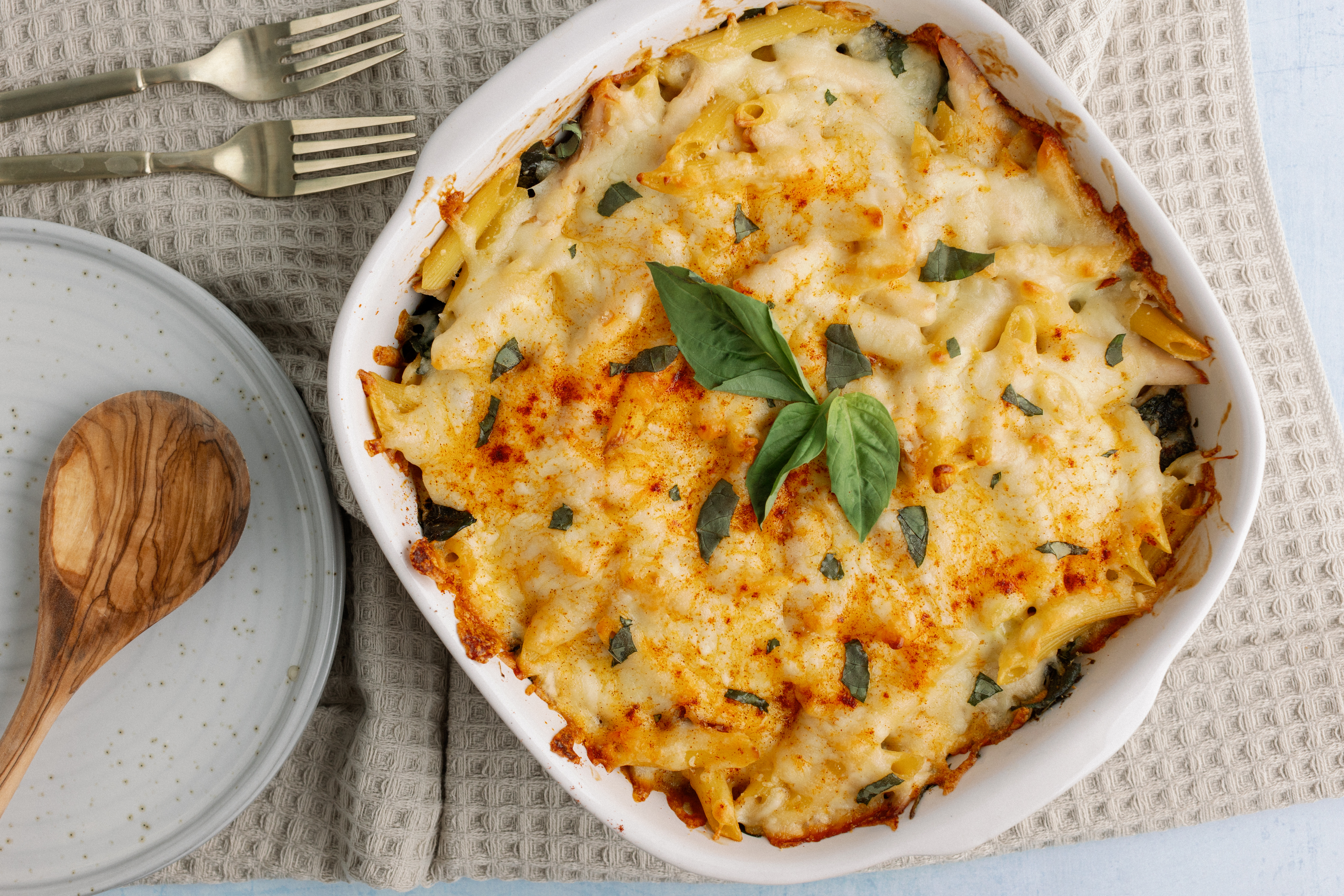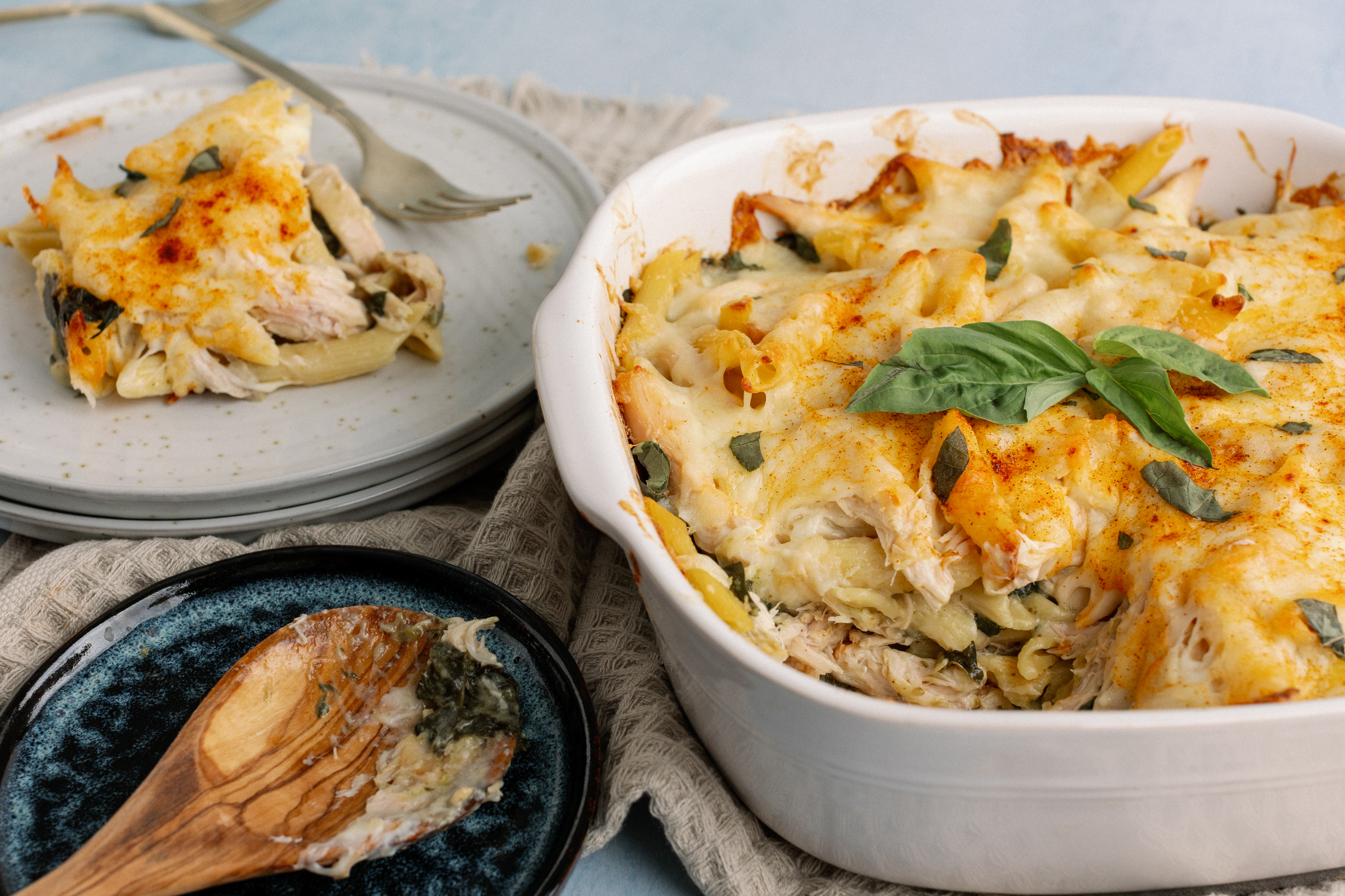 Weeknight Chicken Alfredo Bake is easy, breezy, and delicious; exactly what you need when you're finally home after a long day at work. The sauce is creamy, the chicken is savory, the spinach is fresh, and the cheese is melty. It's like a warm "Welcome Home" in a dish! This Weeknight Chicken Alfredo Bake will make your weeknights so much more fun!