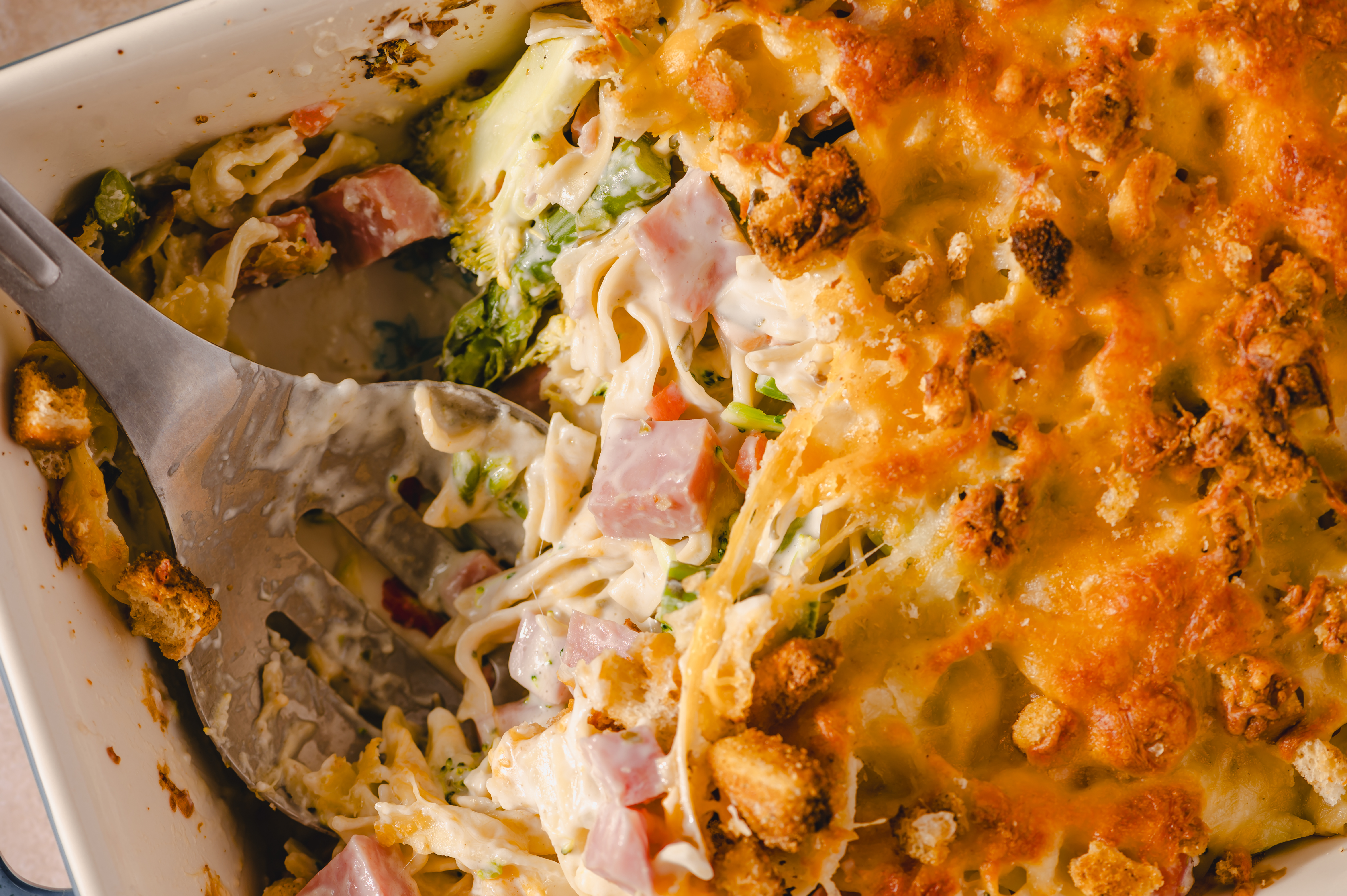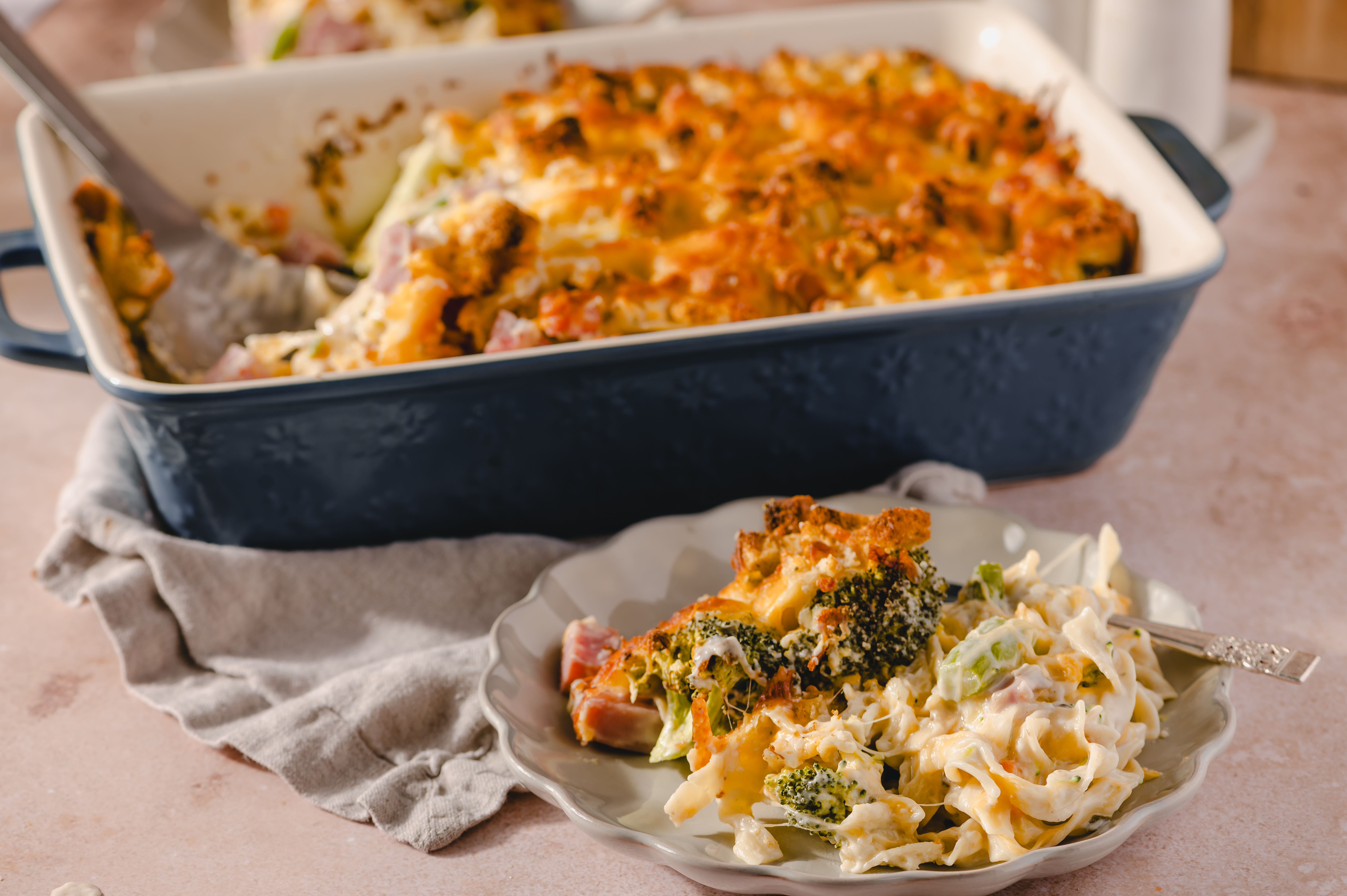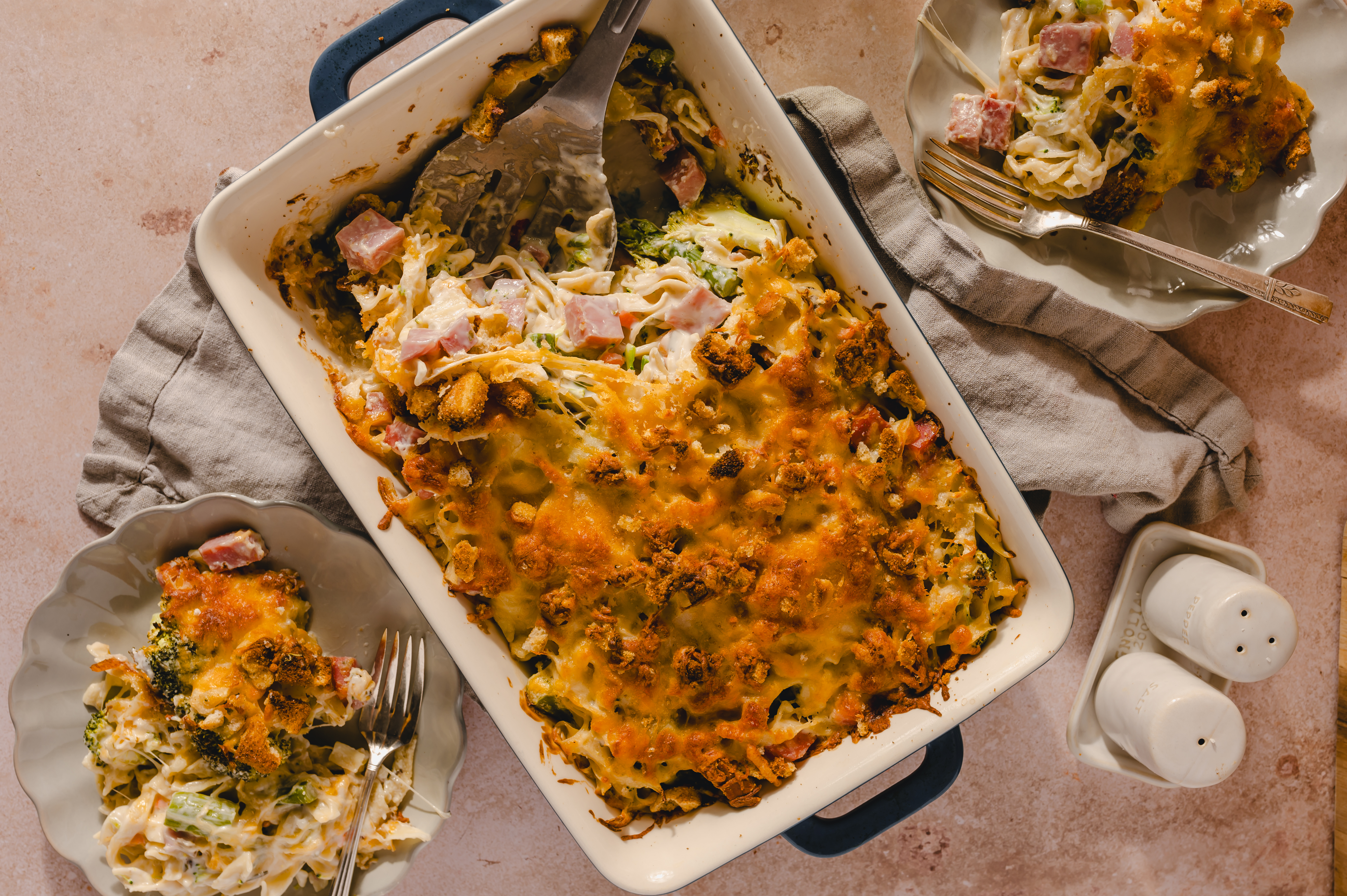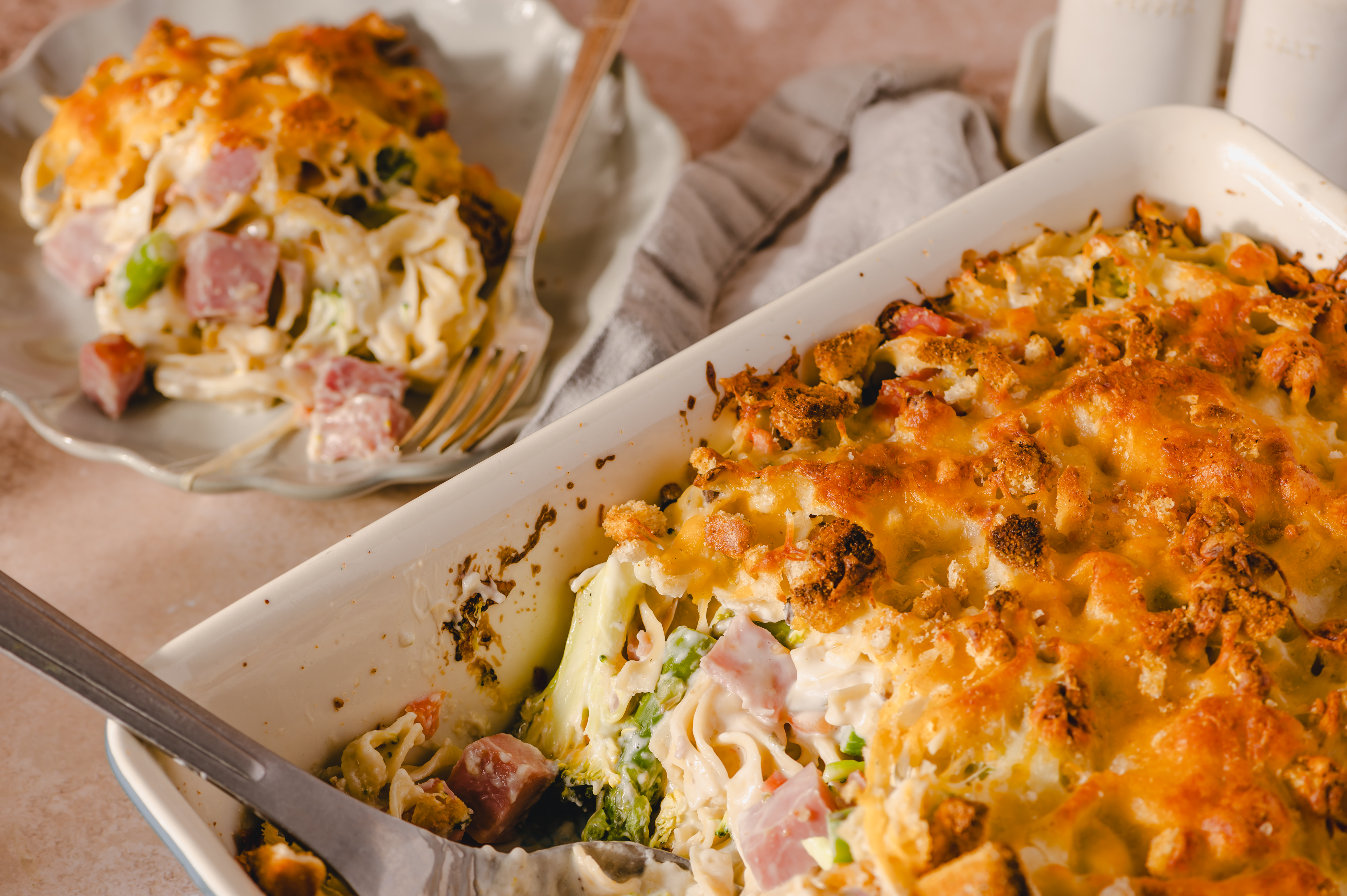 Hey! Long day? We get it, some days can be really long. Why not rest a spell with this Welcome Home Bake? It's the perfect way to unwind with a good meal. Buttery, tender egg noodles in a tangy, creamy sauce, with bites of succulent ham and plenty of crisp and fresh vegetables. Cheesy, crunchy, and amazingly tasty, the Welcome Home Bake really lays out the welcome mat.
